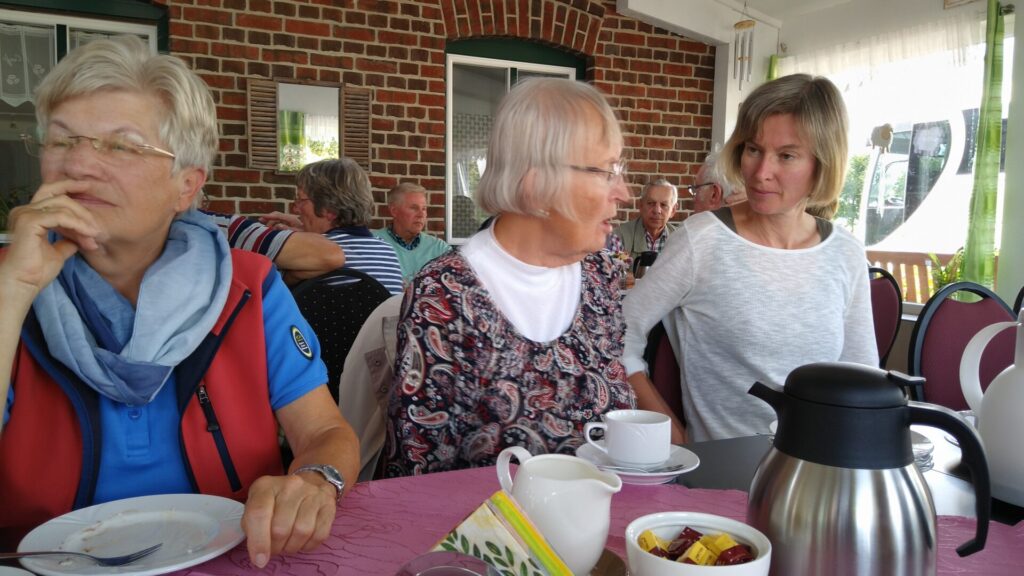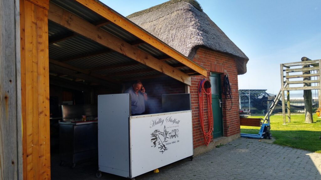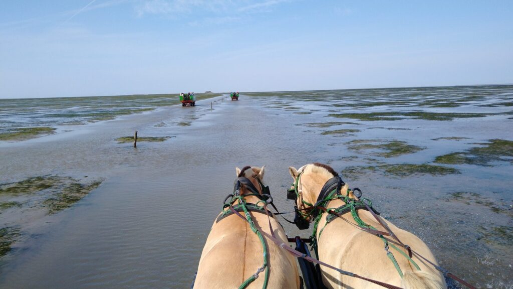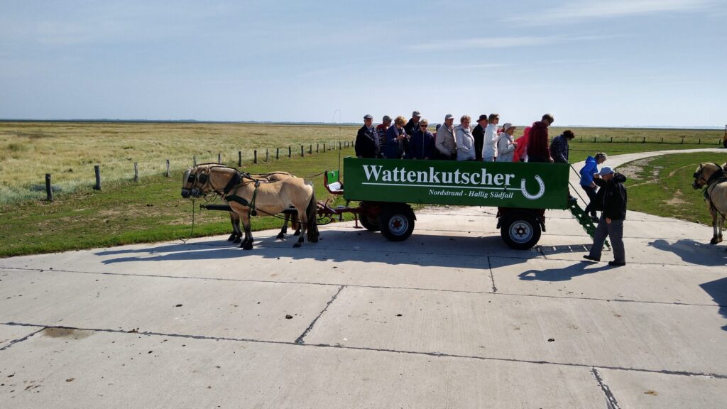 Schöner konnte das Wetter nicht sein. Danke Petrus. Unser Bus war bis auf den letzten Platz gefüllt mit erwartungsvollen, fröhlichen Gästen. Das Reiseunternehmen Breiholz stellte uns eines seiner gut ausgestatteten Reisebusse für die Fahrt nach Nordstrand zur Verfügung. Da wir etwas zu früh ankamen, war noch Gelegenheit zur Vorbereitung auf die anstehende Kutschfahrt. Nun ging es zu Fuß hinter den Deich zum Startplatz der drei Cabrio-Kutschen. Die sechs strammen Norwegerpferde sind auf diese Touren eingestimmt. Nach herzlicher Begrüßung und Briefing der Kutscher und Kutscherinnen ging es ab ins herrliche Wattenmeer unserer schönen Nordsee. In weiter Ferne war winzig klein unser Ziel erkennbar, das wir nach einer knappen Stunde erreichten. Diese wunderschöne Fahrt ist sehr empfehlenswert. Während der Anfahrt erzählten uns die Kutscher/innen viel wissenswertes über die Hallig Südfall, das Wattenmeer, den Nationalpark Wattenmeer, den Untergang von Rungholt und vieles mehr über die 650-jährige Geschichte des sagenumwobenen Rungholtgebietes. Auf Hallig Südfall angekommen, wurden wir ganz herzlich von der Bewohnerin, der „Schimmelreiterin“ Frau Erichsen begrüßt. Sie lebt mit ihrem Mann auf der kleinen aber feinen Warft. Die Tiere, Ziegen , Schafe und Pferde bekamen erstmal einige Extrakarotten. Für das fantastische Grillbuffet, mit den tollen Salaten und das köstliche Grillfleisch, wurde Frau Erichsen und ihre Crew hoch gelobt. Während der Sommermonate herrscht dort täglich Hochbetrieb für die angemeldeten Gäste. Alleingänge zur Hallig sind nicht möglich. Nach Stärkung und Erfrischung am Buffett hielt Frau Erichsen noch eine eindrucksvolle Rede, in der sie viel aus ihrem privaten und Familienleben an der Nordsee preisgab. Dann ging es rechtzeitig zurück mit den Kutschen Richtung Festland; denn Nordstrand ist ja keine Insel mehr. Vielen Dank Familie Erichsen für diese tollen Stunden auf der Hallig Südfall. Danke auch an die Kutscher/innen für den professionellen und freundlichen Job. Mit dem Bus ging es anschließend noch nach Krempel in Ute´s Rad- und Wandercafe zu Kaffee und Kuchen satt, ein Lob für die tollen Kuchen und Torten. Zufrieden und dem Platzen nah ging es dann ab zur Heimfahrt nach Heide. Danke auch an die Fa Breiholz mit seinem netten Busfahrer für die sehr gut organisierte Fahrt. Es war einfach schön !