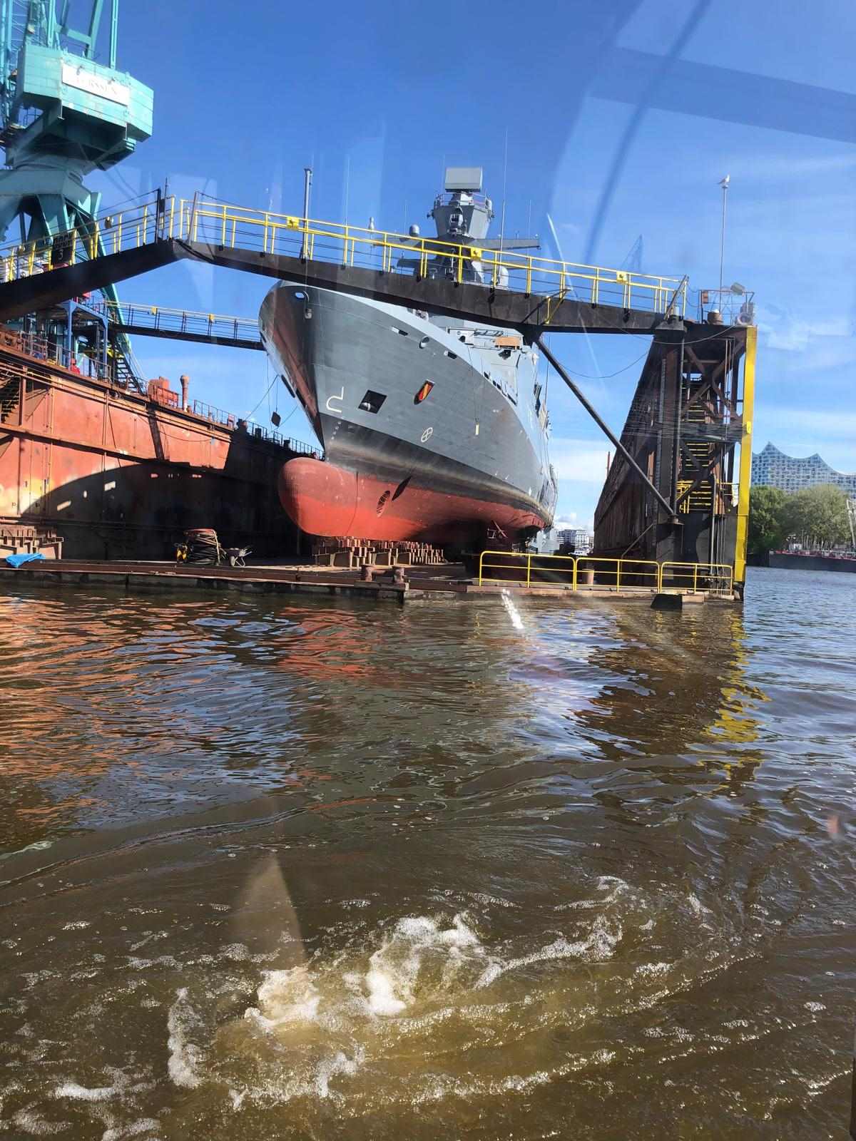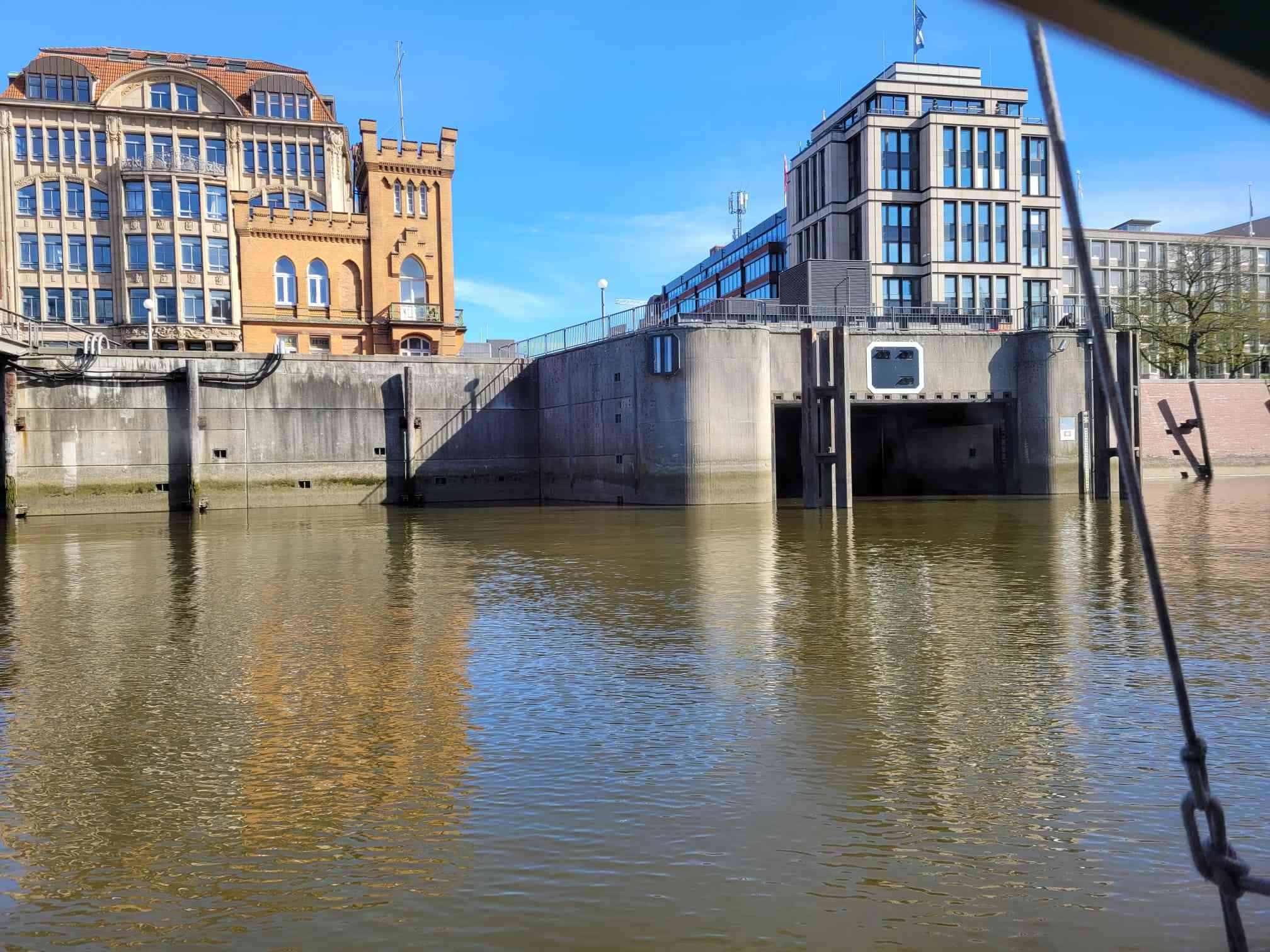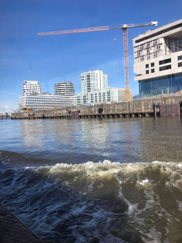 Strahlende Sonne, Gute Laune, Falsche Klamotten… (zu warm). Es war einfach eine Supertour. Mit einer Barkasse, der Reederei Glitscher , die sich ab und an mal schüttelte, ging es um 10:00 Uhr ab den Landungsbrücken durch Fleete und Schleusen. Auf der Elbe schipperte man an großen, neuen und alten Pötten (Cap San Diego, Rickmer Rickmers ), Werften, Burchardkai, Marineschiffen vorbei. 100 Minuten nur Staunen.